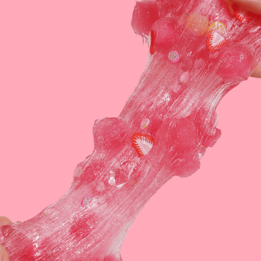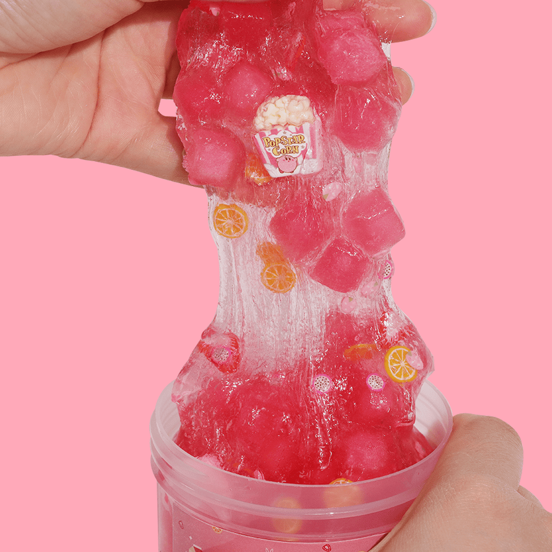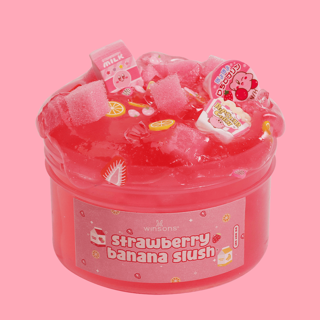 - Strawberry Banana Slush Slime: Semi-jelly slime with strawberry slices, Kirby-inspired milk charms, and sponge cubes for a squishy, textured touch.