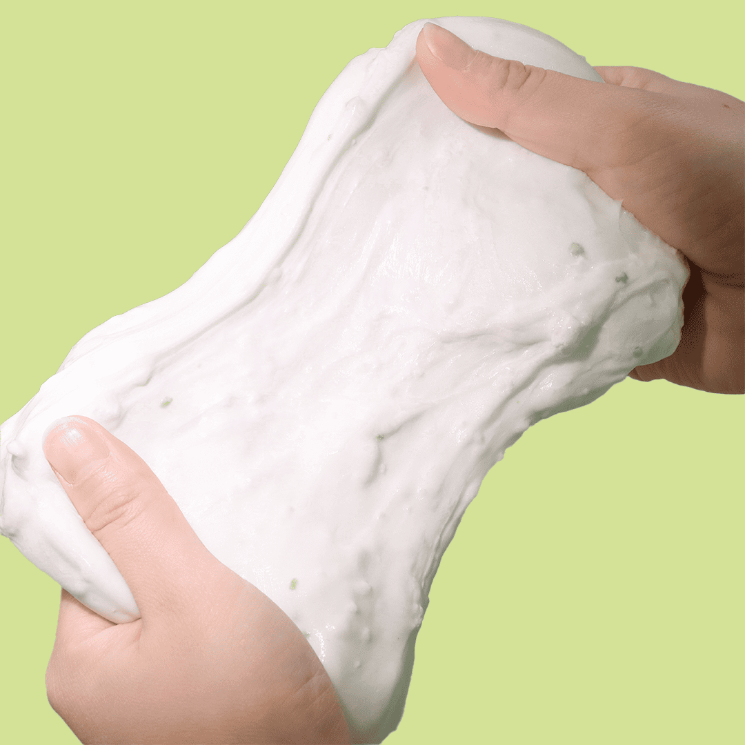 A velvety, frosting-like slime with a smooth, creamy texture, designed for satisfying, stretchy pulls. The glossy slime base blends seamlessly with the soft, eco-friendly clay cake top, offering a delightful, tactile experience. With matcha-inspired faux powder sprinkled on top, it creates a unique, sensory play experience that remains smooth and malleable, never sticky or hard. Perfect for those who enjoy creamy, glossy slimes and tactile play.