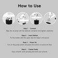 Forget messy pots, thinners, and complicated cleanup! Simply insert your chosen marker, press the button, and start spraying. Change colors in seconds—just switch markers and continue. There's no cleaning needed between colors, keeping your workflow seamless and incredibly efficient.